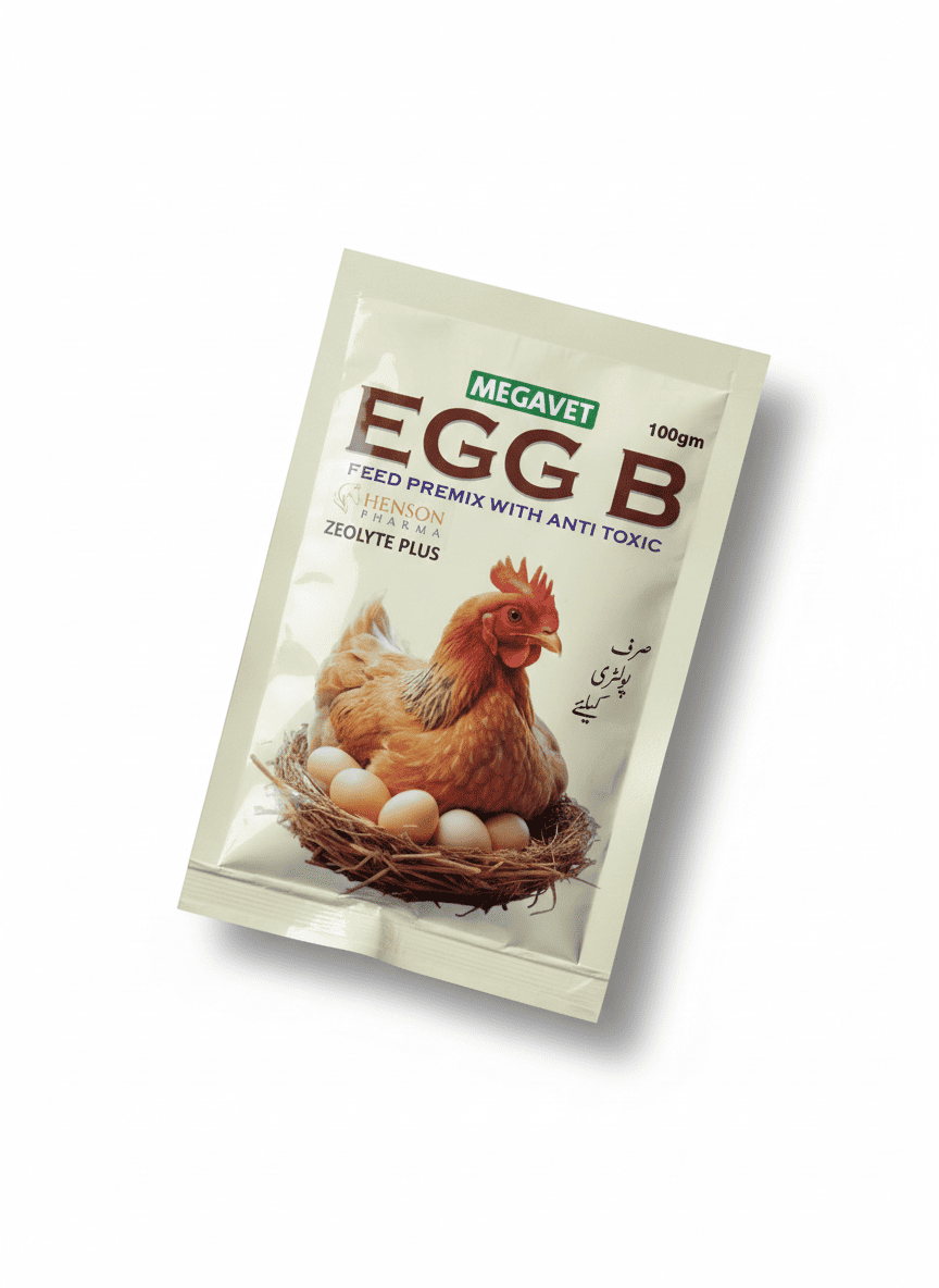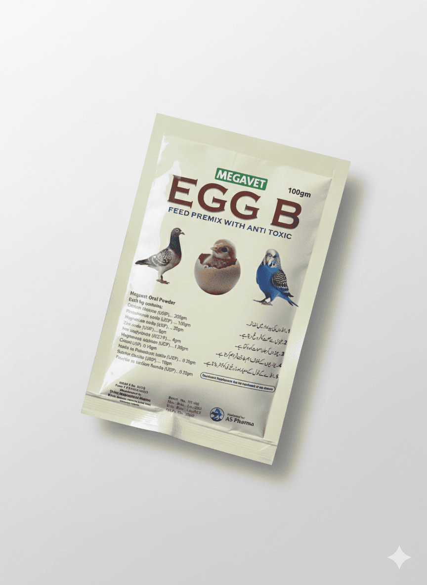 MEGAVET EGG B is a premium oral feed premix specially formulated to support bird health, growth, and egg production. Enriched with essential minerals and anti-toxic properties, it helps strengthen bones, improve eggshell quality, and maintain overall vitality in pigeons, chicks, and pet birds.